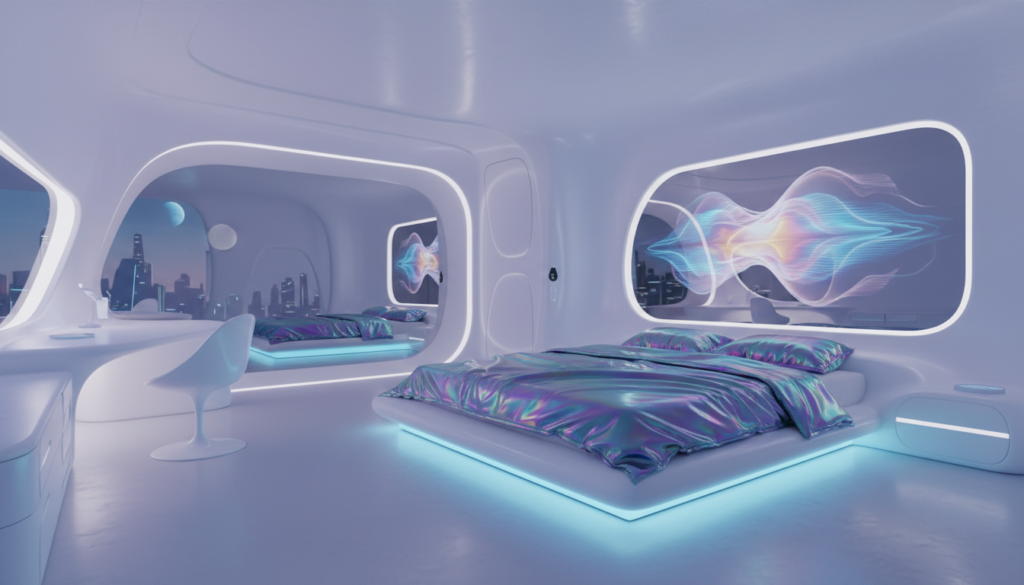 Install color-changing LED strips behind headboards or under furniture to create customizable ambient moods. Choose furniture with fluid, sculptural shapes that seem computer-generated, and incorporate holographic or iridescent textiles that shift color with movement. Smart home integration allows the room to respond to your sleep cycles, adjusting temperature and light to optimize rest in a truly futuristic sanctuary.