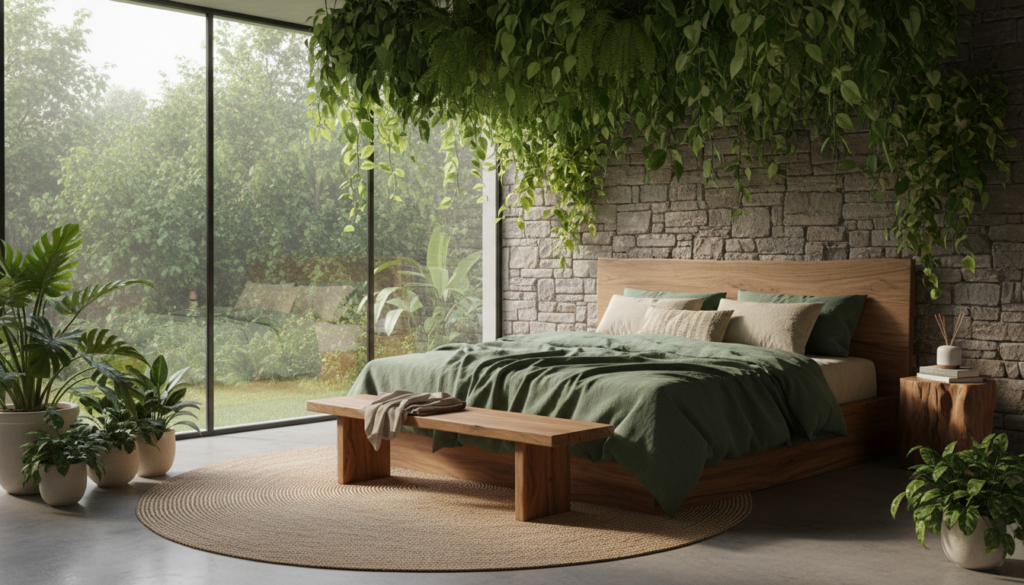 Install a living moss wall or hanging planters to purify air and add vibrant green texture. Choose furniture with organic, curved silhouettes that mimic natural forms, and incorporate raw materials like unfinished wood, stone, and woven fibers. Large windows that frame garden views blur the boundary between inside and out, creating a restorative environment that supports better sleep and mental wellbeing.