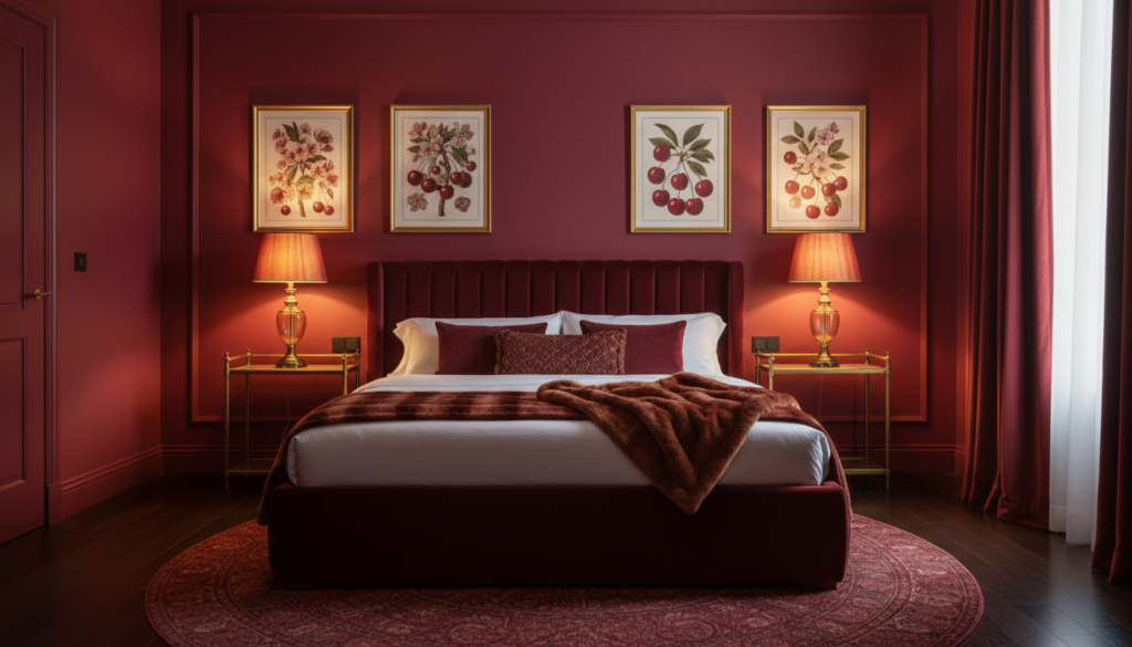Layer varying shades of crimson through velvet bedding, accent walls, and cherry-themed decor pieces for a cohesive monochromatic moment. Balance the intensity with warm wood tones and brass accents to prevent the space from feeling overwhelming. This aesthetic is perfect for those who want their bedroom to make a confident, passionate statement.