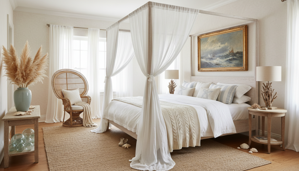 Use a palette of warm whites, sandy beiges, and soft blues inspired by sea and sky. Incorporate natural materials like rattan, driftwood, and linen in sophisticated silhouettes—no starfish or nautical motifs required. Add vintage oil paintings of seascapes, stacks of well-loved books, and ceramic vases filled with dried grasses for a lived-in, literary atmosphere.