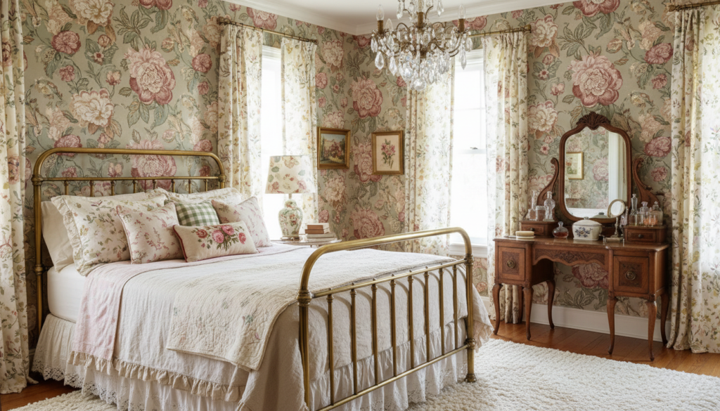 Layer traditional elements like floral wallpapers, ruffled linens, and vintage furniture with contemporary twists.