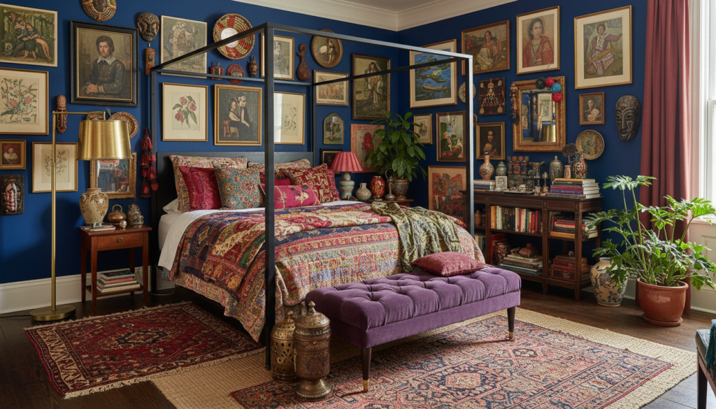 For those who find minimalism uninspiring, this aesthetic embraces bold color, pattern mixing, and abundant texture to create a bedroom that energizes and inspires. Saturated jewel tones—amethyst purple, sapphire blue, and garnet red—combine with global textiles and eclectic art for a rich, layered look.