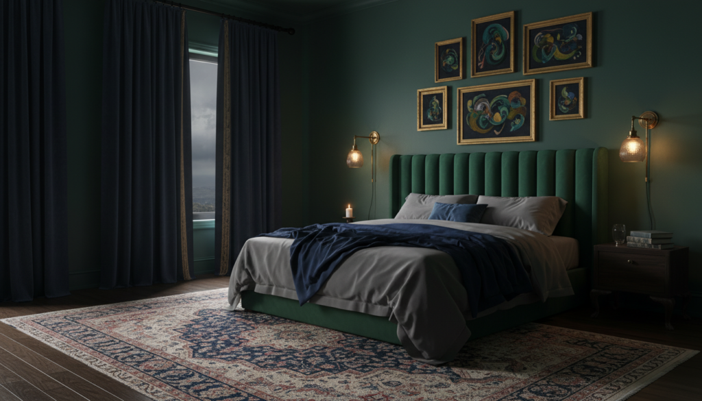 This dramatic aesthetic embraces dark, moody tones and romantic textures to create a bedroom that feels like a luxurious escape from the everyday. Deep navy, forest green, or charcoal walls provide a backdrop for rich jewel tones and metallic accents.