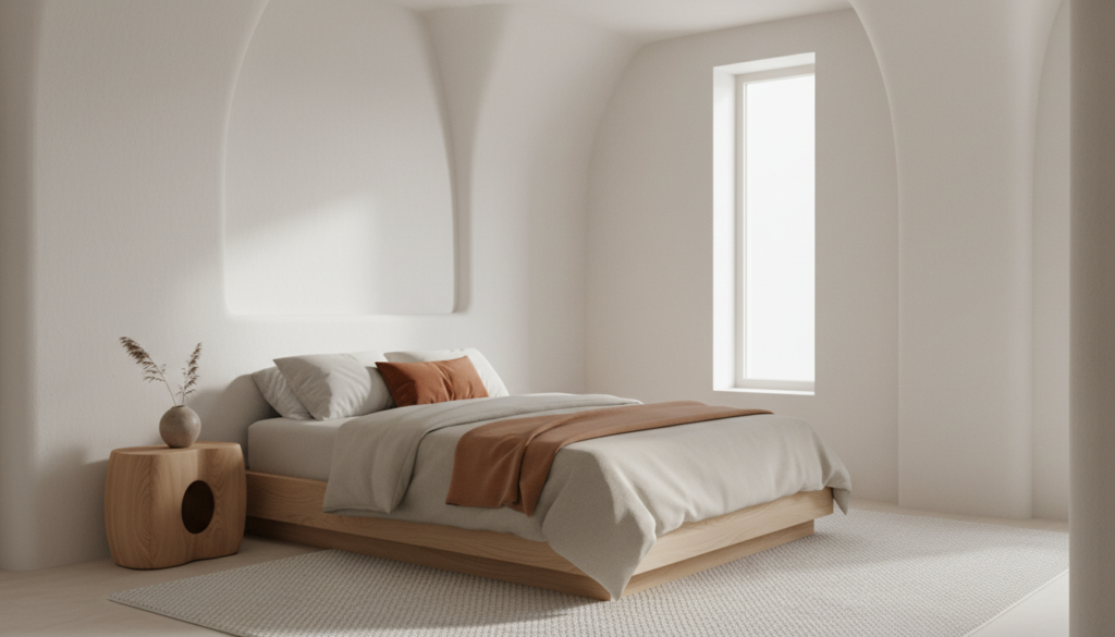Select furniture with rounded edges and organic shapes to soften the clean lines typical of minimalism. Layer textural elements—raw linen bedding, unbleached cotton curtains, and hand-thrown ceramic vessels—to add depth without clutter. The focus remains on quality over quantity, with each piece serving both aesthetic and functional purposes while contributing to an atmosphere of quiet luxury.
