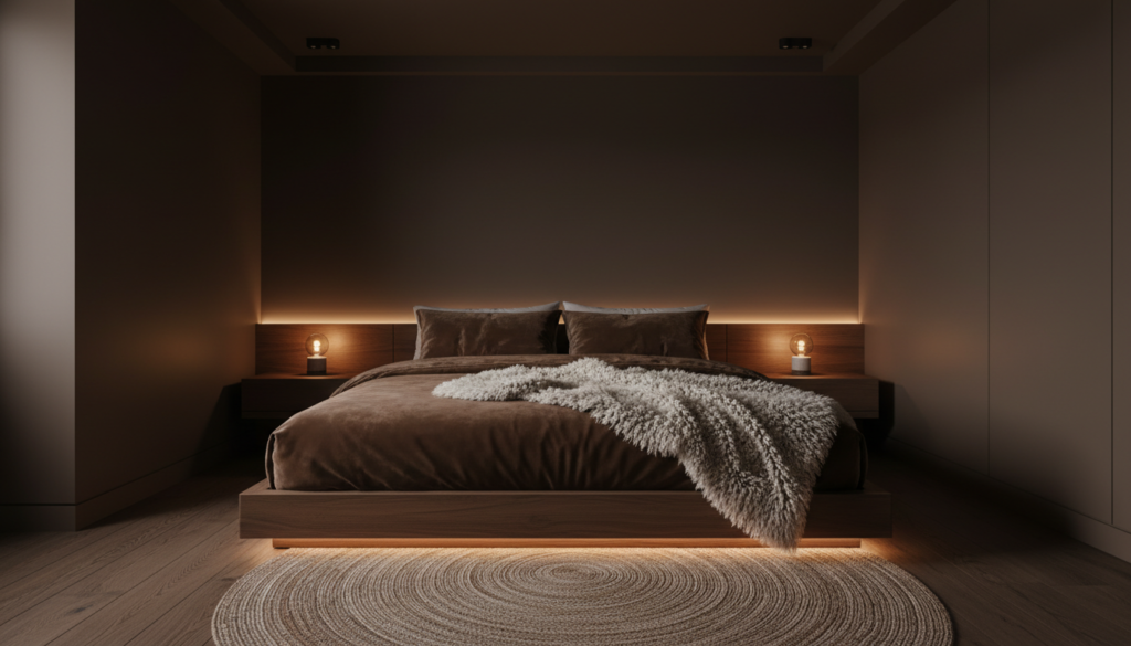 Paint walls, trim, and ceiling in the same deep chocolate tone using varying sheens to create subtle depth without visual interruption. Incorporate plush textures like shearling throws, chunky knits, and velvet cushions in complementary taupe and coffee shades. This monochromatic approach creates a sensual, cave-like intimacy that feels luxurious and secure.