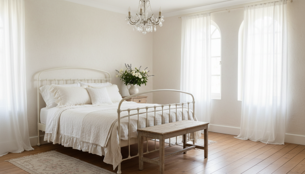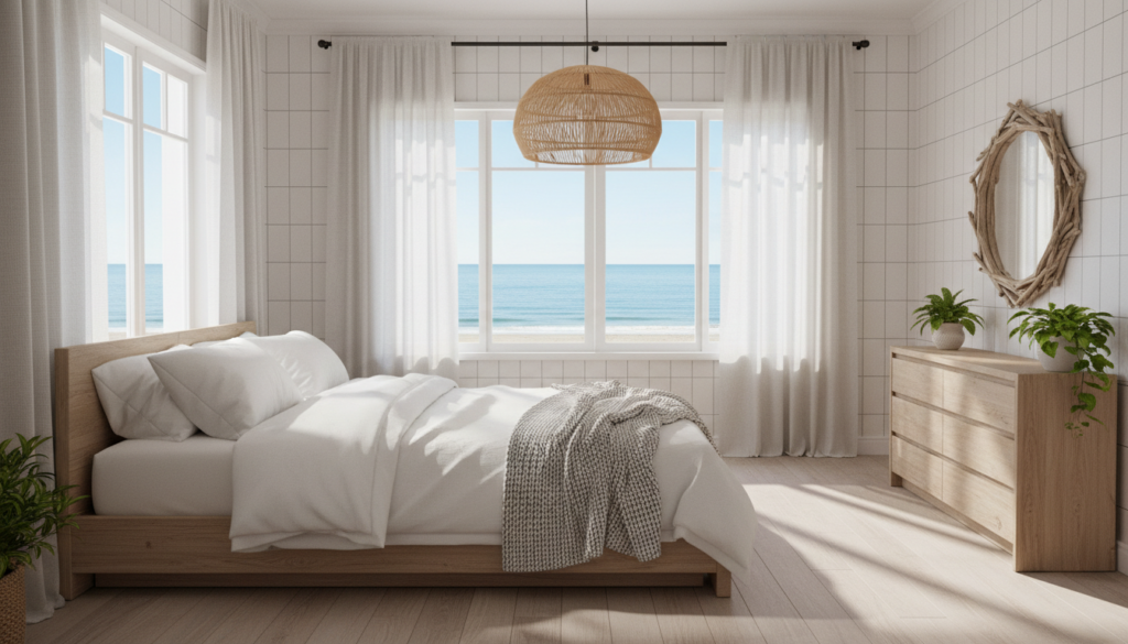Opt for white or cream-painted paneling on walls and ceilings to create architectural interest while reflecting light. Mix vintage wooden furniture pieces with modern lighting fixtures for curated contrast. Soft textiles in natural fibers—cotton quilts, linen sheets, and wool blankets—add layers of comfort without compromising the airy aesthetic.