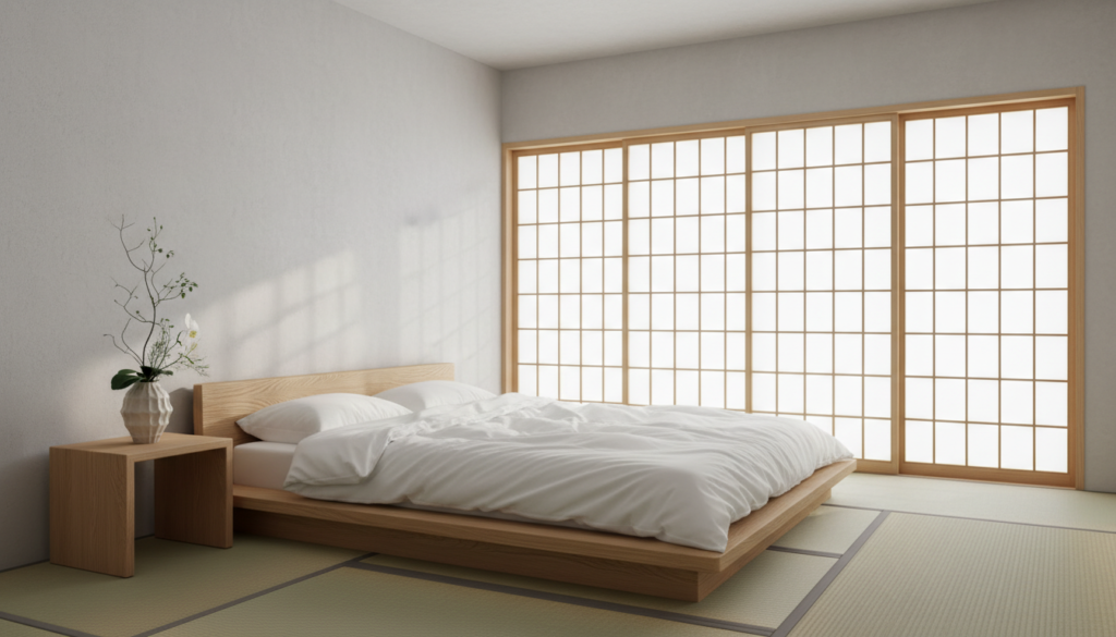 Keep walls in warm off-whites or very pale grays to serve as a backdrop for natural wood furniture with visible grain and texture. Incorporate shoji-inspired screens or rice paper pendant lights to diffuse light softly. Low-profile furniture and floor-level bedding create a grounded, peaceful atmosphere that encourages rest and meditation.