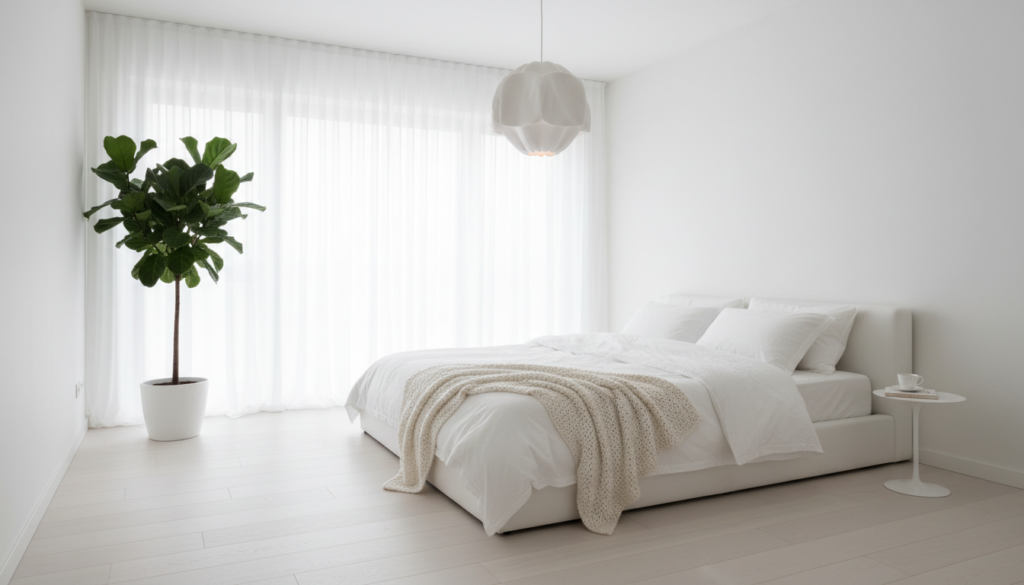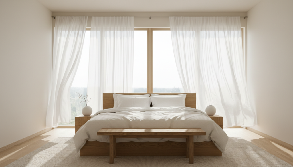 Merge Japanese wabi-sabi principles with Scandinavian functionality for a bedroom that celebrates imperfection and natural beauty.