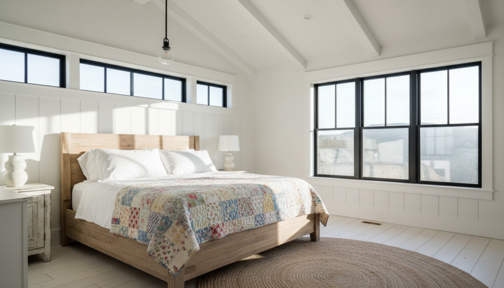 Blend rustic charm with contemporary clean lines for a bedroom that feels both grounded and uplifting. This updated take on farmhouse style emphasizes brightness through painted wood, ample windows, and uncluttered surfaces.