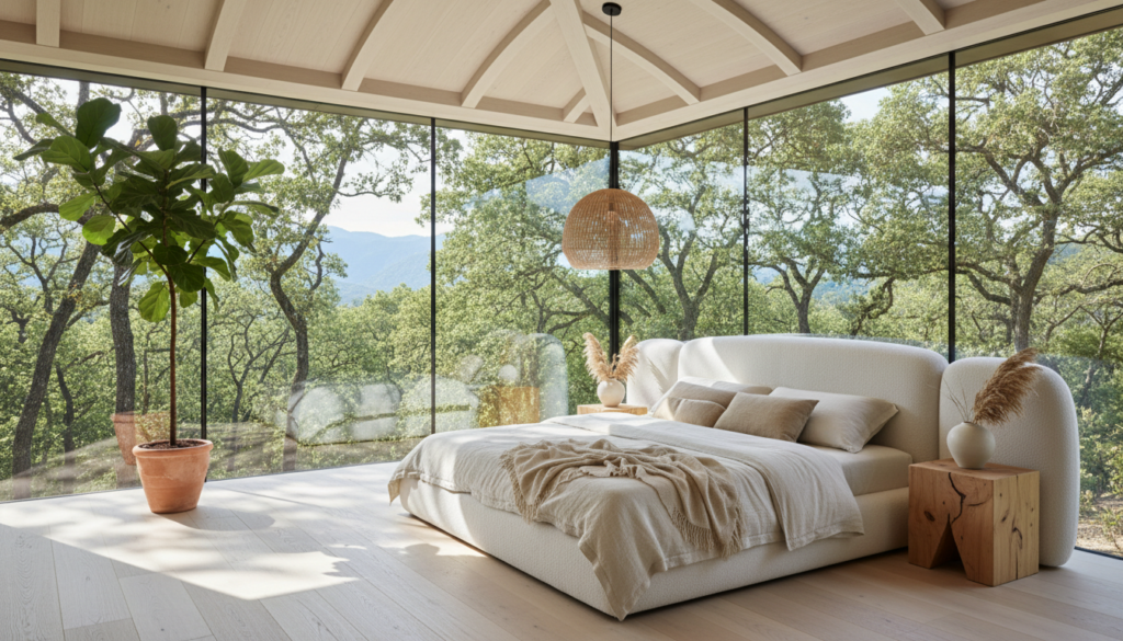 Fuse natural materials with contemporary design for a bedroom that feels both earthy and polished. This aesthetic emphasizes sustainable materials, clean lines, and a light-filled connection to the outdoors.