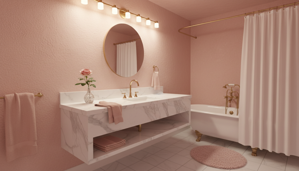 Paint walls or install blush zellige tiles for soft, feminine warmth. The subtle pink flatters skin tones and creates flattering light.