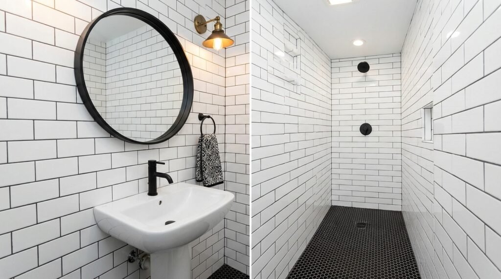 Contrast crisp white subway tile with black hexagon floors and matte black fixtures. The graphic pairing feels timeless and bold.