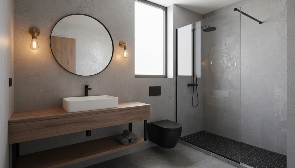 Use polished concrete walls or floors with warm wood vanity for raw, refined contrast. The material pairing feels urban and artisanal.