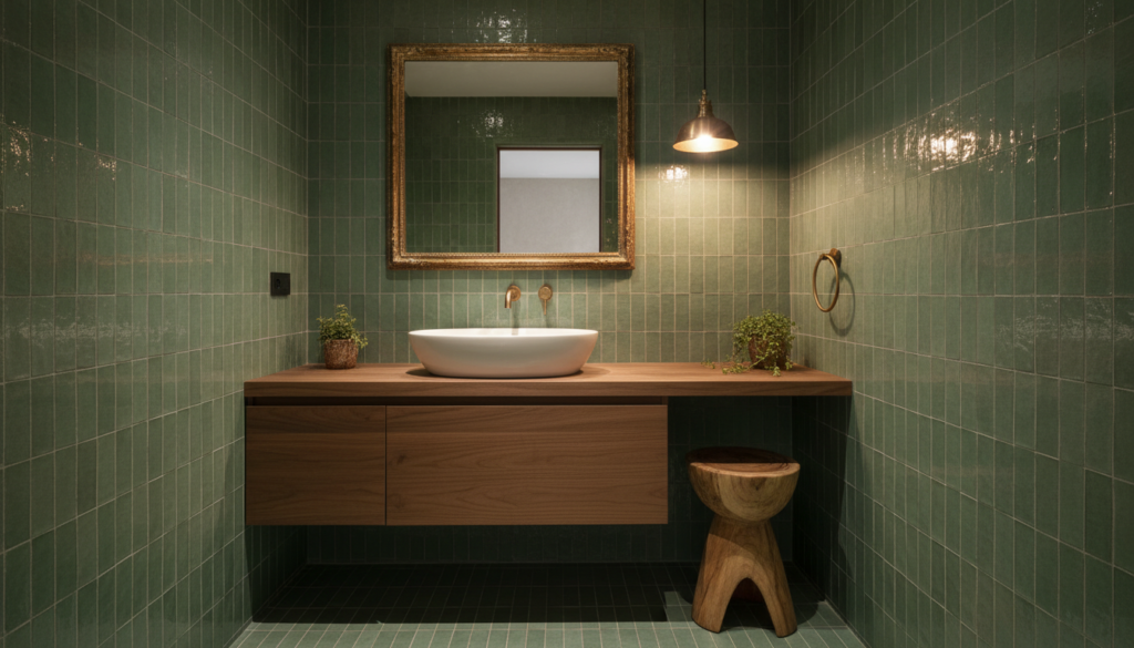Cover walls or floors in sage, olive, or emerald zellige tiles for organic, moody impact. The handmade glaze variation adds depth and artistry.