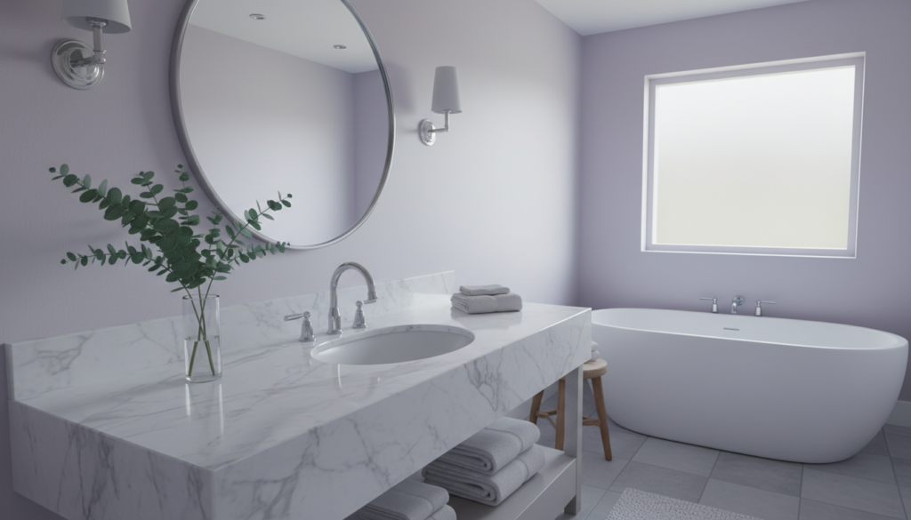 Paint walls soft lavender and pair with polished chrome or silver fixtures for ethereal, calming energy. The purple tone promotes relaxation.