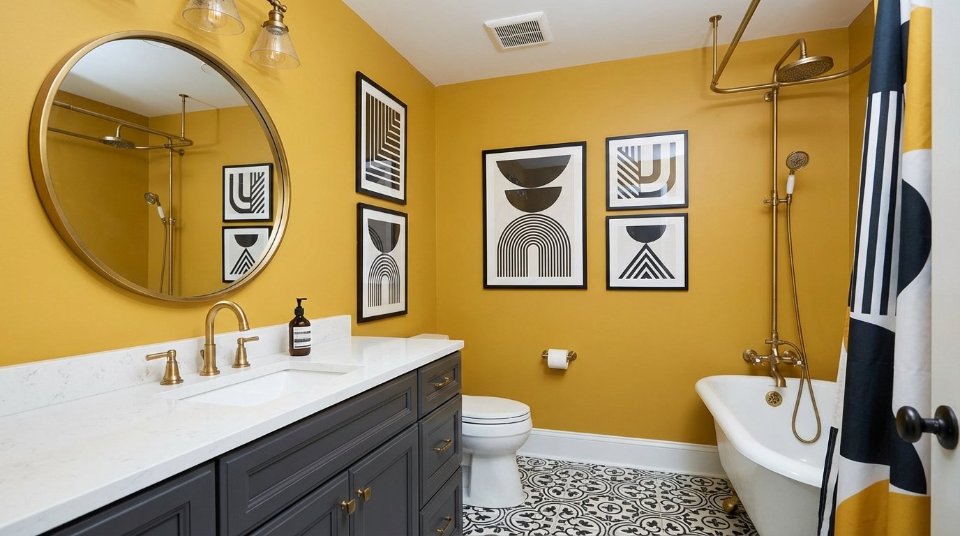 Pair warm mustard yellow walls with charcoal gray vanity for confident, retro-modern impact. The color combination feels daring and cheerful.