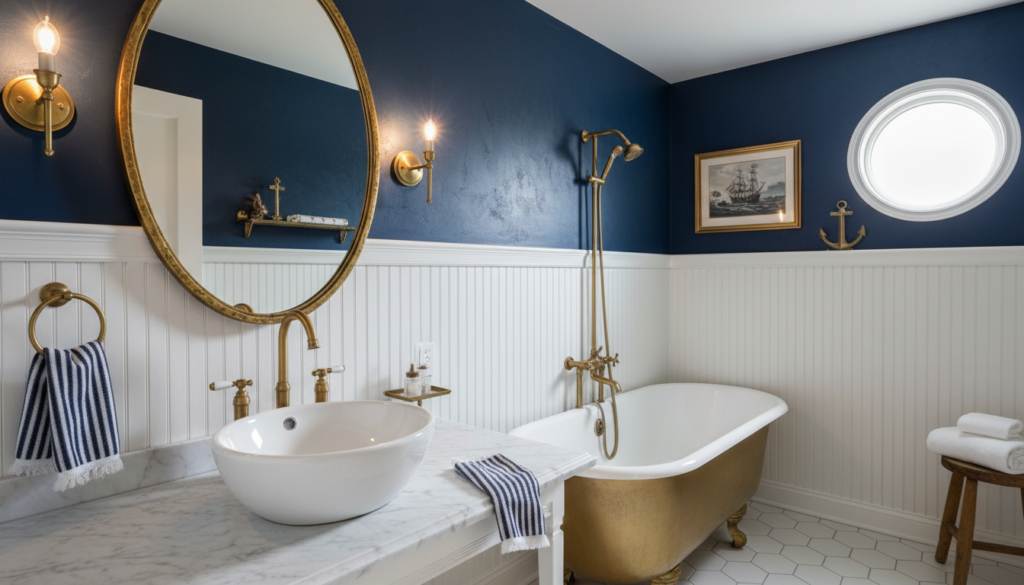 Add white shiplap or beadboard for contrast. The yacht-inspired palette signals refined, adventurous taste.