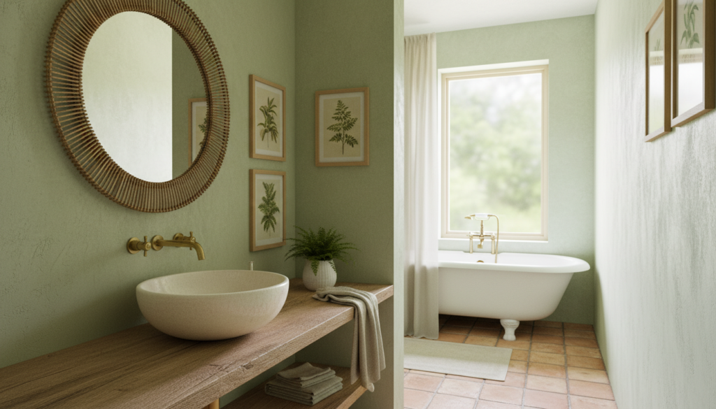 Combine soft sage green walls with cream fixtures and natural rattan for quiet, botanical calm. The muted palette feels like a breath of fresh air.