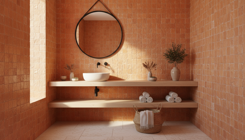 Use warm terracotta tiles or plaster walls for sun-baked, Mediterranean energy. The earthy orange-brown feels grounded and welcoming.