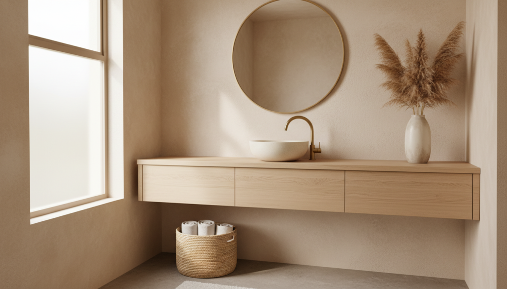 Add texture through woven baskets, linen towels, and a single dried arrangement. The tonal harmony creates sophisticated serenity.