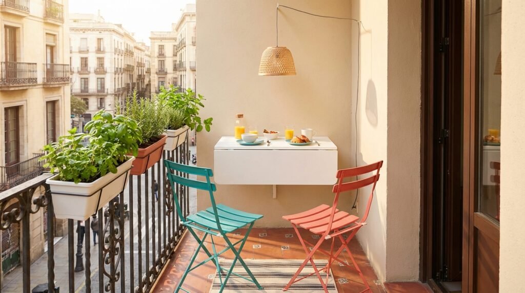 Add a small herb garden on the railing for fresh cooking ingredients. The functional design maximizes every inch.
