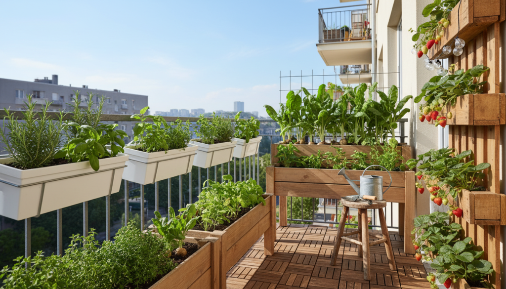 Transform the balcony into a productive growing space with raised planters, railing boxes, and vertical herb walls. The edible garden provides fresh ingredients and green therapy.