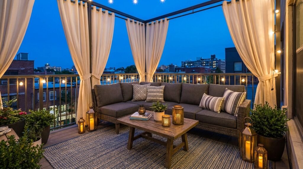 Add outdoor curtains for privacy and shade. The comfortable setup encourages daily use rather than occasional storage.