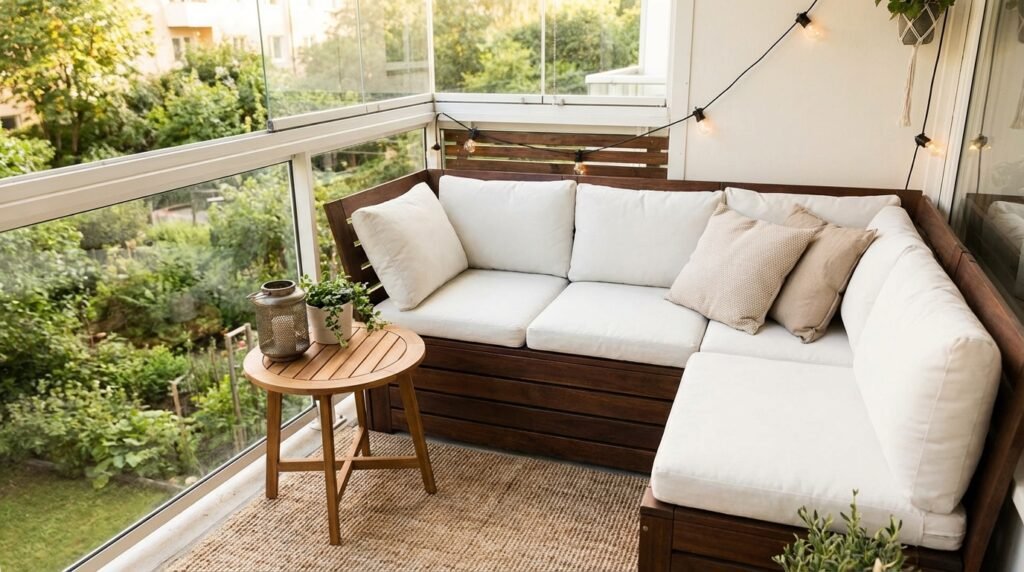 Treat the balcony as an outdoor living room with weather-resistant sofa, outdoor rug, and coffee table. The furnished approach extends usable square footage.