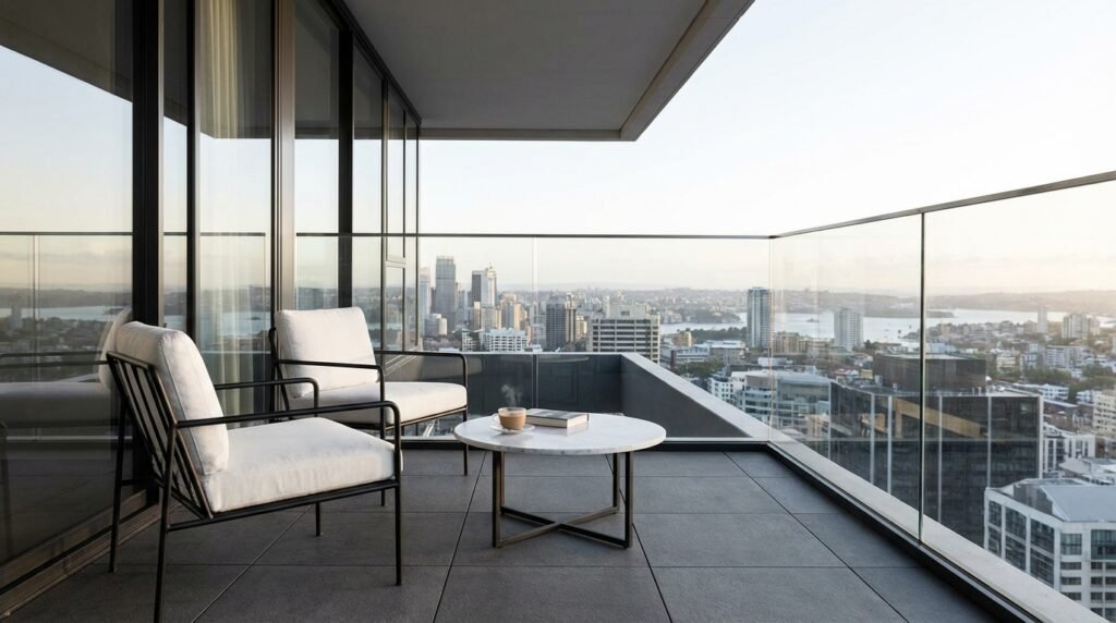 Replace solid railings with frameless glass panels for unobstructed views and visual expansion. The transparent barrier makes small balconies feel larger.