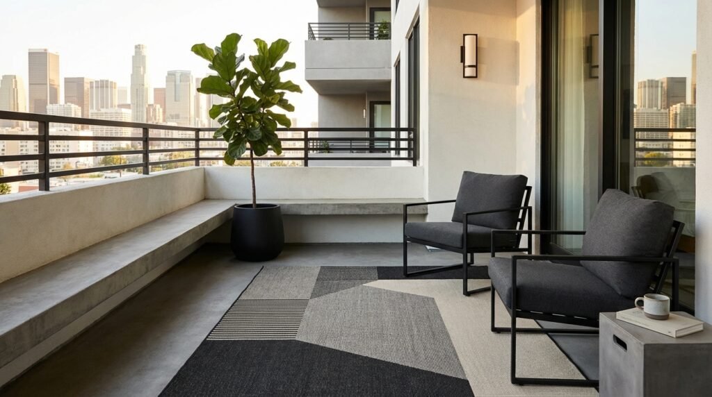 Add a single sculptural plant and geometric outdoor rug for softness. The industrial aesthetic suits modern architecture.