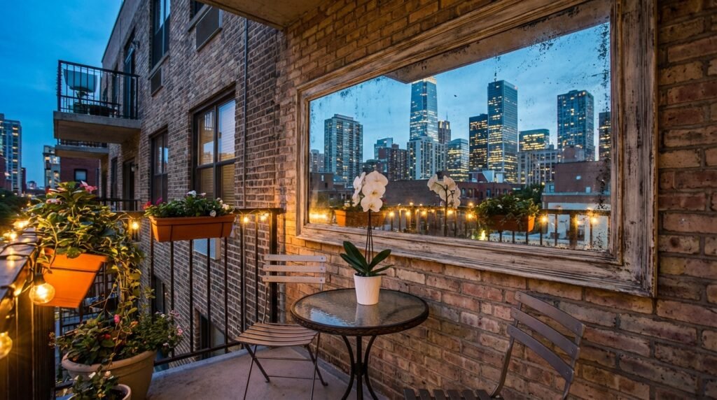 Install a large mirror on one wall to reflect light and visually double the space. The reflective surface creates depth in tight urban balconies.