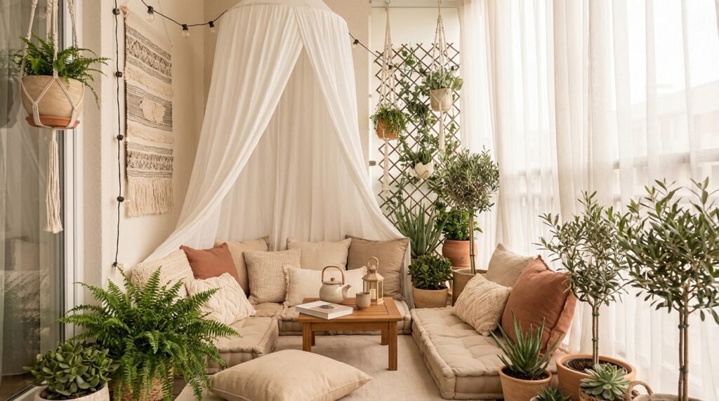 Add floor cushions and low table for casual lounging. The bohemian approach feels relaxed and Instagram-worthy.