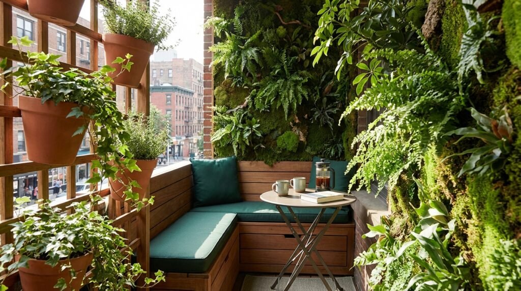 Add a slim bench with storage underneath and a small folding table. The biophilic design brings nature to urban living.