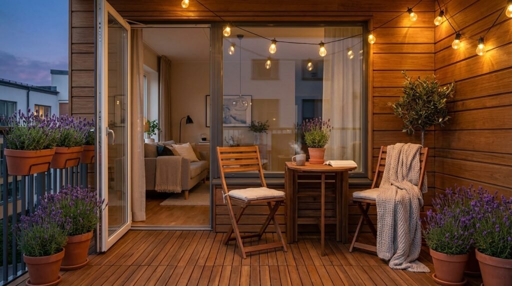 Add foldable wood chairs and a small round table for morning coffee. String lights overhead extend usability into evening.
