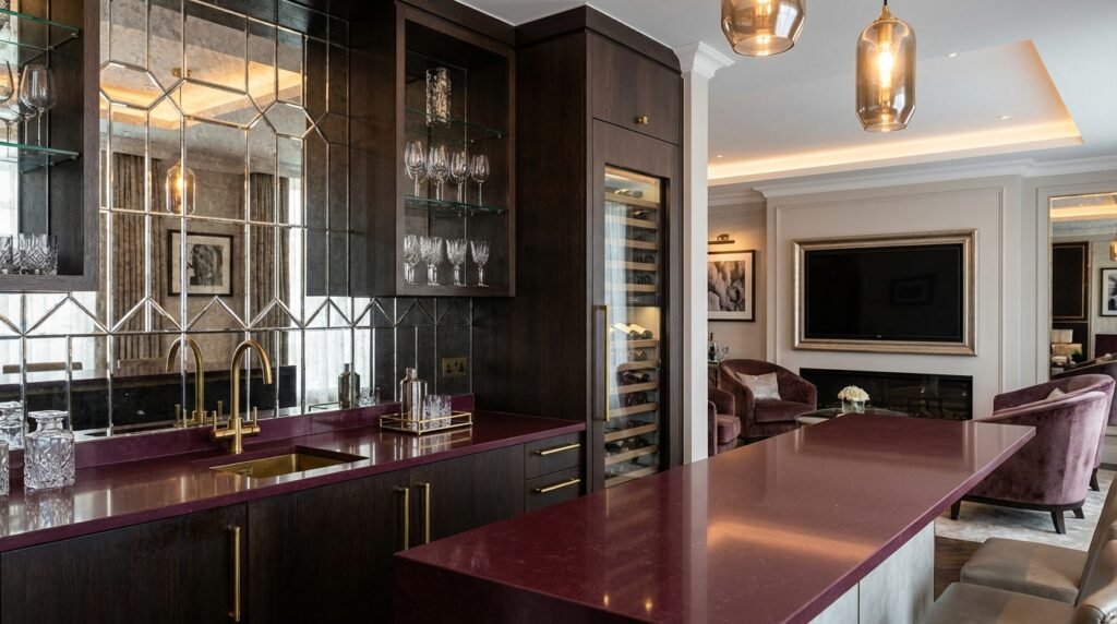 Use mirrored tiles, bold stone, or unexpected colors to differentiate the zone. The bar becomes a secondary focal point for experimentation and personal style expression.