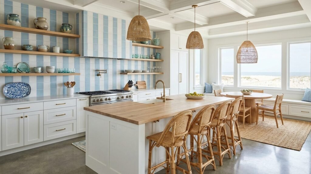 Choose soft, beachy tones for coastal vibes or darker, shorter stripes for contemporary edge. The pattern works on floors, backsplashes, or island fronts, creating Instagram-worthy moments that stop the scroll.