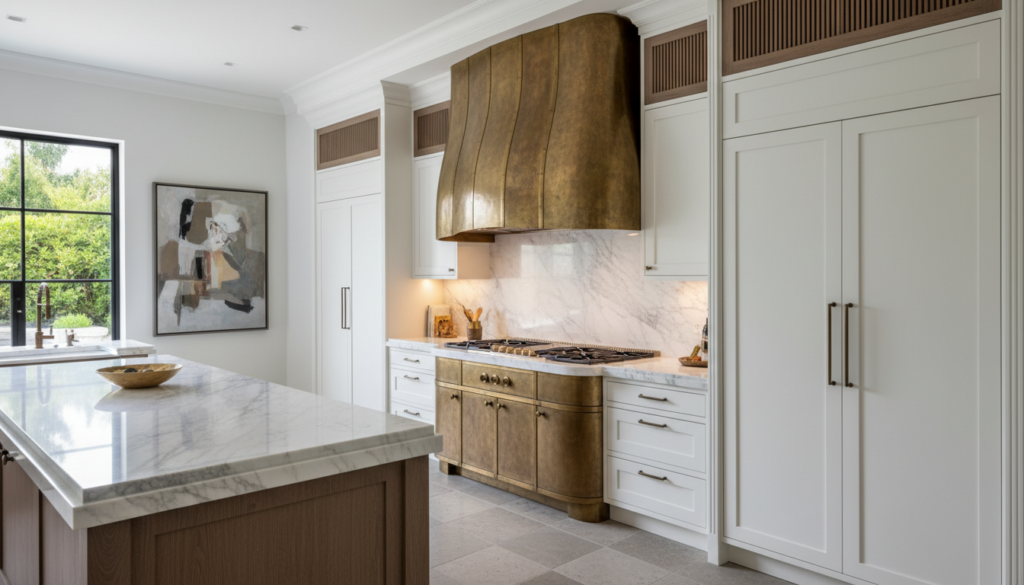 Transform the utilitarian vent hood into a sculptural focal point with custom millwork, patina finishes, or integrated curves.