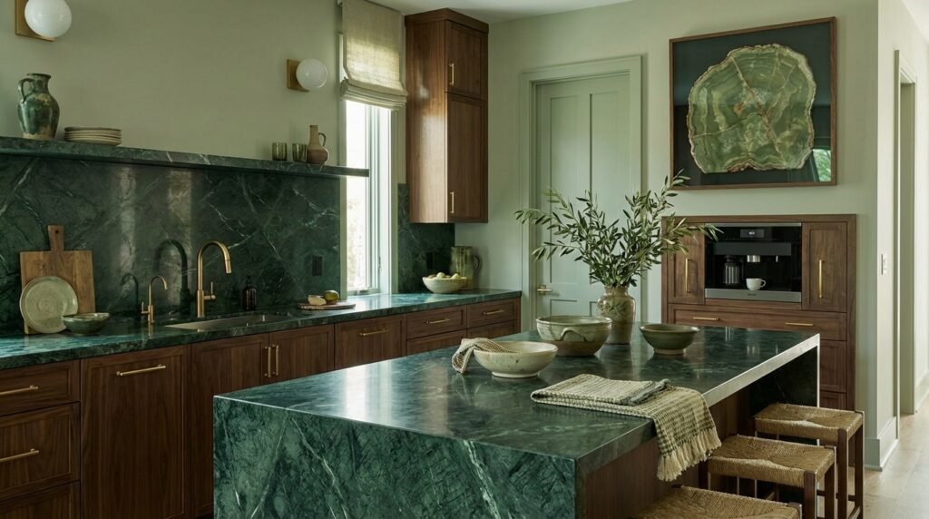Transform your kitchen with green marble or granite countertops that serve as functional art.