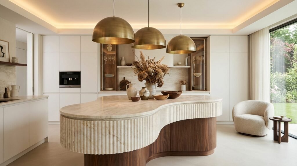 Create furniture-like focal points with curved, mixed-material kitchen islands that blur function and sculpture.