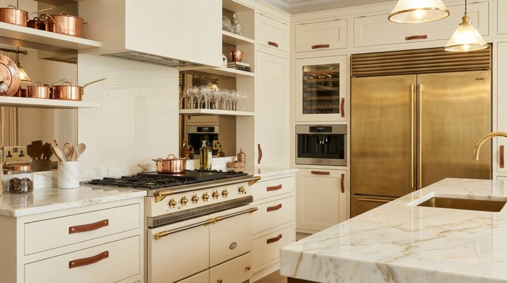 The seamless integration of appliances and cabinetry creates a cohesive, restaurant-quality environment. Add warm wood tones and soft lighting to prevent coldness, achieving that perfect balance of utilitarian luxury and residential comfort.