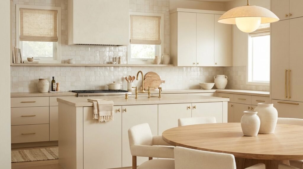 Drench your entire kitchen in tonal layers of cream, beige, or warm gray for immersive sophistication.