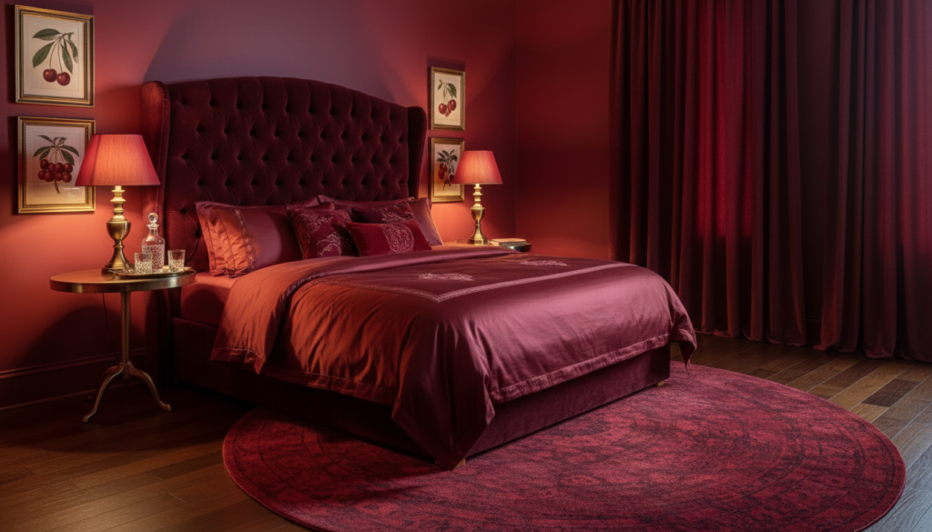 Layer varying shades of crimson through velvet bedding, accent walls, and cherry-themed decor pieces for a cohesive monochromatic moment. Balance the intensity with warm wood tones and brass accents to prevent the space from feeling overwhelming. This aesthetic is perfect for those who want their bedroom to make a confident, passionate statement that photographs beautifully for social media.
