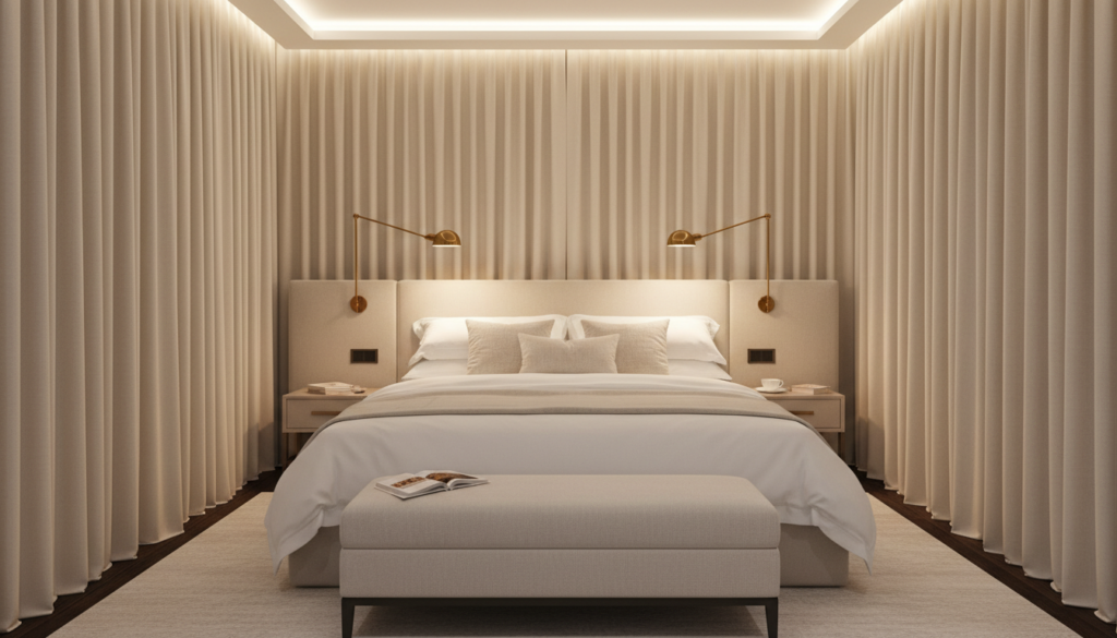 Set crown molding a few inches forward to conceal the ceiling track for a seamless look. Use heavy velvet for dramatic enclosure or sheer linen for ethereal softness. This creates a hotel-suite aesthetic that feels both luxurious and intimate, perfect for creating that “main character” bedroom energy.