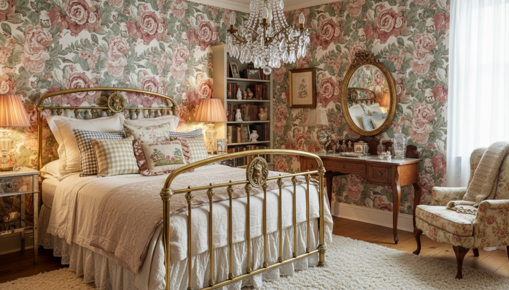 Layer traditional elements like floral wallpapers, ruffled linens, and vintage furniture with contemporary twists.