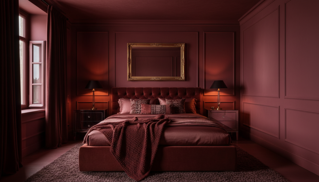 Layer different textures within the same tonal family—lacquered walls against plush velvets or matte plaster—to create depth rather than visual overload. This bold approach creates stunning visual content that performs exceptionally well on social platforms, offering a striking alternative to sterile white bedrooms.