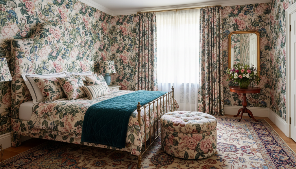 Use floral wallpapers that continue onto upholstered headboards, matching curtains, and bedding for a cohesive visual field. Secondary patterns layered in can support the mood without detracting from the immersive quality. This maximalist approach creates instantly viral content that celebrates individuality over minimalism.