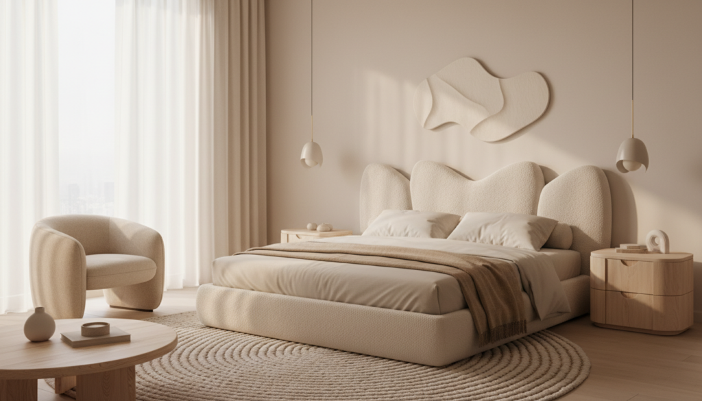 Incorporate plush, curved sofas or armchairs that invite sinking in and unwinding. These softer silhouettes extend to everything from sculptural side tables to gracefully curving consoles, creating a wonderful sense of flow throughout the bedroom. This approachable aesthetic photographs beautifully and promotes a sense of well-being.
