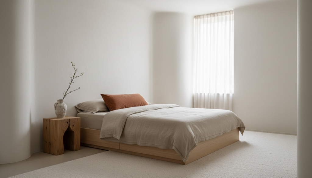Select furniture with rounded edges and organic shapes to soften clean lines. Layer textural elements—raw linen bedding, unbleached cotton curtains, and hand-thrown ceramic vessels—to add depth without clutter. The focus remains on quality over quantity, with each piece serving both aesthetic and functional purposes while creating viral-worthy quiet luxury.